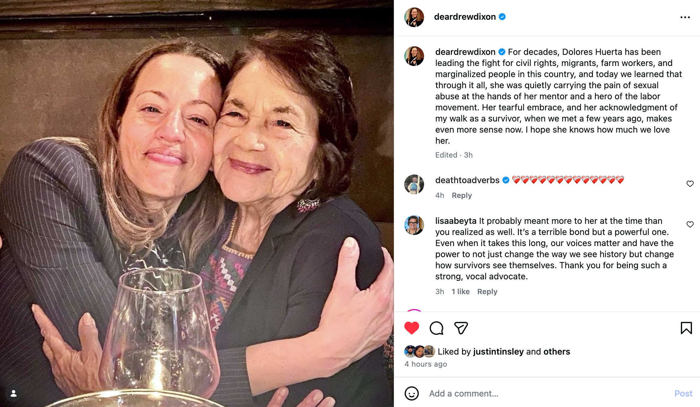 “I carried this secret for as long as I did because building the movement and securing farmworker rights was my life’s work,” she wrote. “The formation of a union was the only vehicle to accomplish and secure those rights, and I wasn’t going to let Cesar or anyone else get in the way. I channeled everything I had into advocating on behalf of millions of farmworkers and others who were suffering and deserved equal rights.”